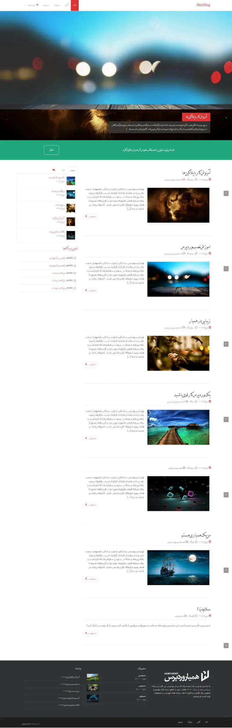 قالب وردپرس Dazzling یکی از قالبهای رایگان و محبوب وردپرس است که با طراحی مدرن، سرعت بالا و انعطافپذیری زیاد، برای انواع سایتها از جمله وبلاگ، فروشگاه اینترنتی، خبری، سایت شرکتی و شخصی مناسب است. این قالب با استفاده از چارچوب قدرتمند Bootstrap 3 طراحی شده و از طراحی کاملاً واکنشگرا پشتیبانی میکند تا محتوای سایت شما در هر دستگاهی، از موبایل گرفته تا لپتاپ، بهزیبایی نمایش داده شود. Dazzling با افزونههای محبوبی مانند WooCommerce، Contact Form 7 و Jetpack کاملاً سازگار است و به شما این امکان را میدهد که بدون محدودیت، قابلیتهای سایت خود را گسترش دهید. همچنین امکان شخصیسازی آسان رنگها، فونتها، منوها و بخش اسلایدر از طریق تنظیمات پوسته باعث میشود بتوانید سایت خود را دقیقاً مطابق سلیقه و نیازتان طراحی کنید.