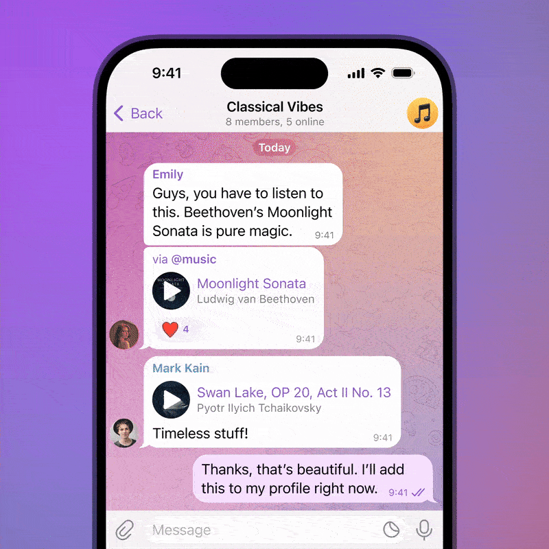 در گزارشی که تلگرام از جدیدترین آپدیت خود منتشر کرده، موسیقی در پروفایل تلگرام حالا به واقعیت پیوسته است. کاربران میتوانند فایلهای صوتی مورد علاقه خود را با یک کلیک ساده به پروفایل اضافه کنند. این قطعات موسیقی در نواری زیر عکس پروفایل نمایش داده میشوند تا بازدیدکنندگان بتوانند به سلیقه موسیقایی صاحب پروفایل پی ببرند.